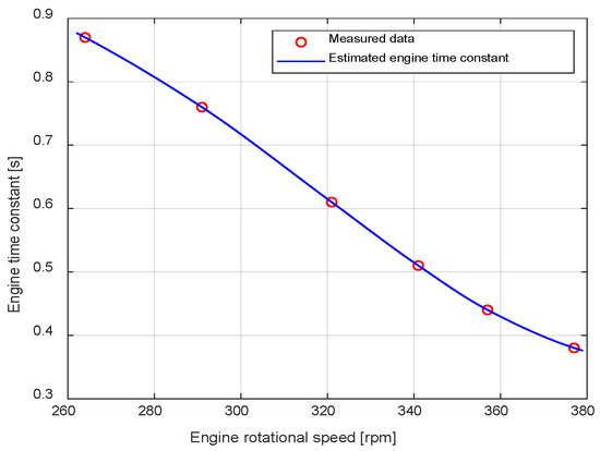 Figure 5, Figure 6, Figure 7 and Figure 8 show the relationships between fuel flow rate, engine speed, rack position, and engine time constant obtained from the engine operating data. From these relationships, the engine time constant = 0.565 and steady-state gain = 11.251 of the DE at the operating point of 330 rpm are determined.