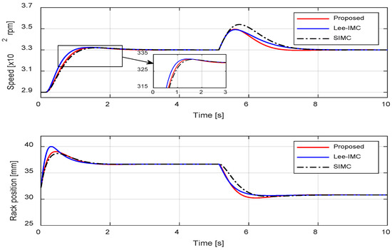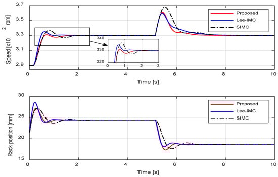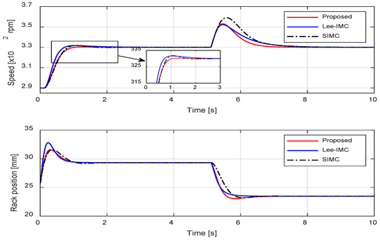 Figure 12 shows the response under nominal conditions when a set-point of 330 rpm is applied as a step input at t = 0 s while the DE operates at a rotational speed of 290 rpm, and a load disturbance input is introduced as a step input at t = 5 s. The load disturbance assumes that wind is applied from the stern to the naval ship’s bow, reducing the fuel rack’s position by about 5.9 mm. When operating at 330 rpm, the position of the fuel rack is about 29.3 mm, corresponding to a fuel flow rate of about 900 kg/h as derived from Figure 8. Due to the wind disturbance, the fuel flow rate must be reduced by approximately 210 kg/h.