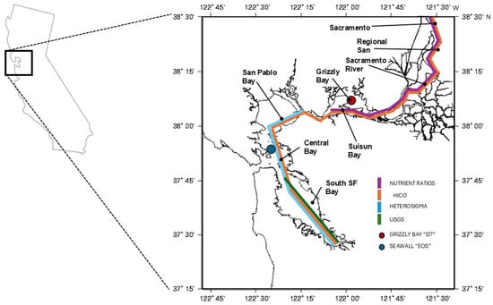 The San Francisco Estuary (SFE) is an urbanized estuary with altered freshwater flows from a changing climate and municipal and agricultural water demand, nutrient input from wastewater and agriculture, and introduced species, primarily through ballast water introductions. Beginning in the mid-1980s the northern SFE experienced a decline in phytoplankton biomass, despite high nutrient concentrations [], and was described as a high-nutrient, low-chlorophyll system [], like the high-nutrient low-growth (HNLG) in the Delaware Estuary []. Summer phytoplankton blooms, dominated by diatoms, were observed in the northernmost embayment, Suisun Bay, during the 1970s, supporting a rich pelagic food web []. Blooms of the magnitude once seen occur only rarely today [,,,]. Not only has overall phytoplankton biomass decreased, but also the composition of the phytoplankton community has shifted away from diatoms with an increasing contribution by picocyanobacteria [,].