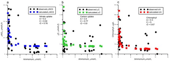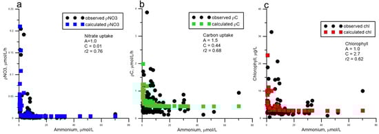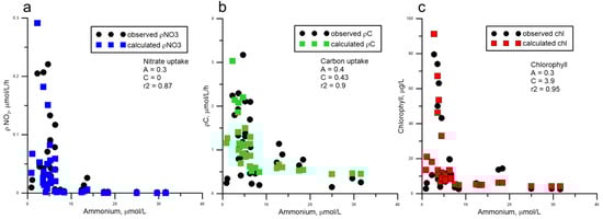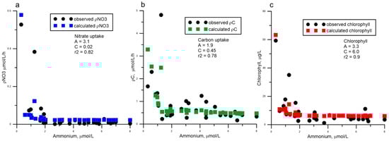 (a) NO3 uptake (µmol/L/h); (b) carbon uptake (µmol/L/h); and (c) chlorophyll (µg/L) vs. NH4 (µmol/L) for D7 from projects conducted 2011–2016 (observed data, black circles) combined with least squares best fit and solver calculated values (blue, green, and red squares, respectively).