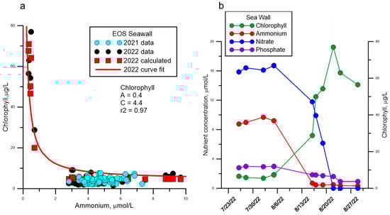 Data collected from the EOS Seawall. (a) Chlorophyll (µg/L) versus NH4 (µmol/L) measured from January to December in 2021 (cyan circles) and 2022 (black circles) with least squares hyperbolic curve fitted using Equation (1) and calculated chlorophyll for 2022; (b) time series in August 2022 of concentrations of chlorophyll (green circles), NH4 (red circles), NO3 (blue circles), and phosphate (purple circles).