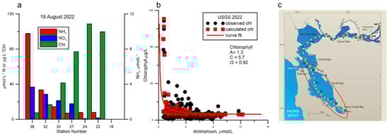 Data collected by USGS. (a) Concentrations of NH4 (µmol/L, red), NO3 (µmol/L, blue), and chlorophyll (µg/L, green) measured on 19 August 2022 at stations 18 to 36 along a north–south transect in South San Francisco Bay shown as red circled location in the map (c); (b) chlorophyll (µg/L) versus NH4 (µmol/L) over the entire 2022 that includes 12 monthly transects of the entire SFE (stations are represented by the yellow dots in (c)), measured by USGS (black circles) and solver calculated values (red squares) and curve (red line) fitted using Equation (1); (c) map to show transect and stations 18–36.