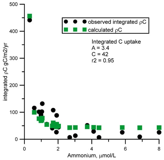 Observed depth-integrated ρC (gC/m2/yr) vs. NH4 (µmol/L) for D7 from 20 cruises in 2011 and 2012 (SWAMP project []) (black circles), combined with least squares best fit solver calculated values (green squares) using Equation (1).