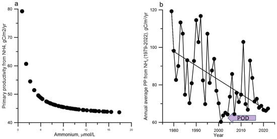 In addition, the higher annual productivity predicted from lower ambient NH4 at the start of the time series in the late 1970s (Figure 9b) coincides with the timing of the productive summer diatom blooms (e.g., 70 µg/L []). This offers promise for using ammonium to help assess historical productivity. The next step in such a process could be to use productivity estimates obtained like this to estimate fish yield using published relationships (e.g., [,,,]).