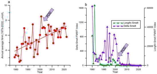 (a) Annual average surface ammonium (µmol/L) at D7 from 1979 to 2022 with linear regression (r2 = 0.4); (b) annual fish indices of Delta Smelt (purple triangles) and Longfin Smelt (green) plotted against the year of sampling. Arrows show the start of the POD.