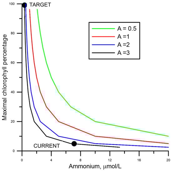 Calculated maximal chlorophyll percentage vs. NH4 (µmol/L) using varying A—NH4 impact factor. Black circles indicate the current situation at D7 and the NH4 required for the maximum chlorophyll when A = 3.