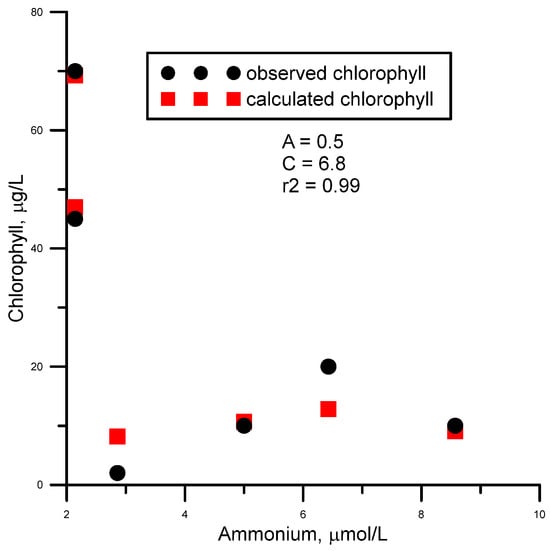 Ball and Arthur [] observed peak chlorophyll concentrations in 1979 at D7 of 70 µg/L with an NH4 concentration of 2 µmol/L. When their dataset was plotted (Figure 12), the parameters from the rectangular hyperbolic relationship were A = 0.5, C = 6.8 with r2 of 0.99. The observed value of NH4 of 2 µmol/L for peak chlorophyll values would have been predicted when using A = 0.5 by Figure 11, supporting this approach.