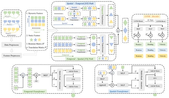 Our dual-path spatial–temporal attention network (DualSTMA), enhanced with multi-attribute information, explores vessel trajectory prediction from two complementary spatiotemporal perspectives: the ST path and the TS path. We first categorize attribute features into dynamic and static types, processing and integrating them into the network separately. The temporal transformer and spatial transformer then apply self-attention and cross-attention mechanisms to model temporal and spatial relationships. Additionally, the model employs an LSTM as the decoder, with different MLPs used to predict position, heading, and velocity.