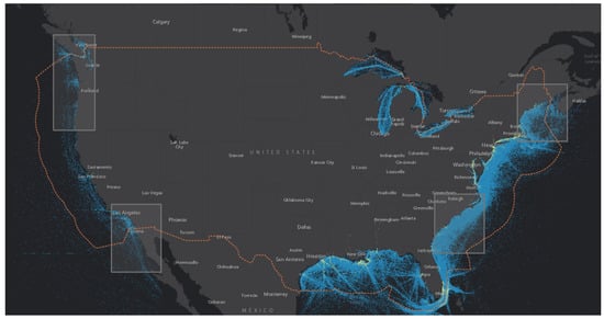 Geographical coverage of AIS data in major U.S. coastal regions, including representative areas in the eastern, western, and southern parts of the United States. The boxes represent the four regions where the dataset is collected, while the blue line visualizes the estimated coverage of AIS data throughout the year 2021.