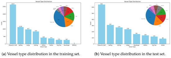 The primary dataset is divided into training, validation, and test sets with an 8:1:1 ratio, containing 27,313; 3414; and 3415 trajectory segments, respectively, and involving 6927; 1983; and 1980 vessels. Statistical analysis and visualization of vessel types in the training and test sets are provided in bar and pie charts (see Figure 3a,b). The analysis shows that the vessel type distribution is largely consistent across the training and test sets, ensuring that the model’s performance remains comparable and stable across different data sets. The dataset includes eight major vessel types, such as pleasure crafts, sailing, cargo, and fishing vessels, providing comprehensive support for model training.