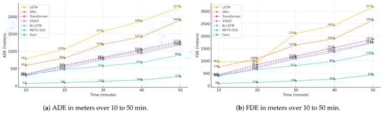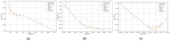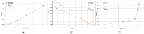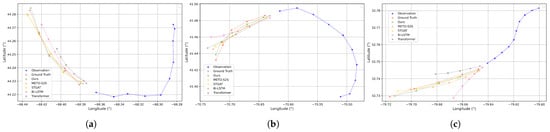 In the sharp turn scenario, the vessel undergoes significant directional changes, as depicted in Figure 8a–c. Sharp turns involve both directional and speed changes, posing a greater challenge to the prediction models. In this case, the baseline models struggle, displaying significant errors in predicting the trajectory post-turn. In contrast, our model successfully follows the trajectory’s change of direction and predicts the future path with greater accuracy, closely matching the ground truth. This indicates that our model has strong prediction capabilities in handling sharp turns.
