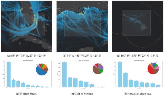 The dataset used in this paper is primarily based on the publicly available data from the official U.S. Marine website in 2021. As shown in Figure 2, the data cover major coastal areas in the eastern, western, and southern regions of the United States, with specific sampling ranges listed in Table 1, which outlines four representative coastal areas. Additionally, to further assess the model’s generalizability across diverse environments, supplementary AIS data from Hawaiian deep sea areas, the Gulf of Mexico, and the Florida Strait are collected as independent test sets. Detailed information on these will be discussed in the generalization experiments section.