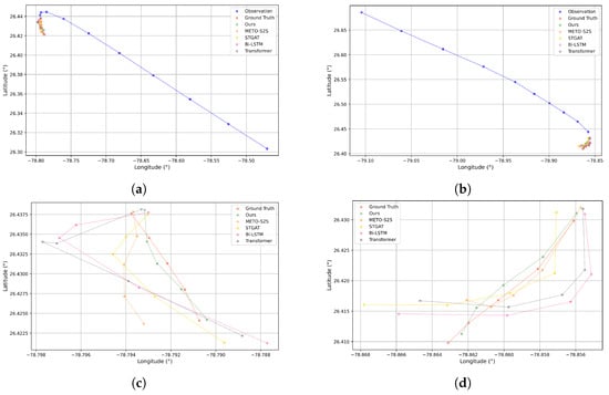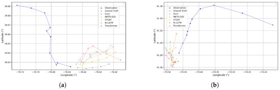 In the emergency stop scenario, the intervals between past trajectory points decrease, indicating that the vessel is slowing down or stopping, as shown in Figure 9a,b. The baseline models struggle in this scenario, failing to capture the vessel’s deceleration, and thus predicting future trajectory points with uniform spacing. Our model, on the other hand, accurately recognizes the slowing down behavior and predicts smaller intervals between future points, demonstrating its sensitivity and robustness in handling sudden changes in speed.