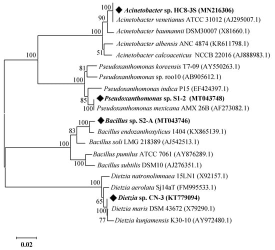 Through acclimatization in MSM media with high salt and crude oil concentrations, strains S1-2 and S2-A were newly isolated from crude-oil-contaminated saline soil at Shengli Oilfield for further analysis. Strain S1-2, a Gram-negative bacterium, formed yellow, smooth, viscous, slightly opaque colonies with entire margins (0.5–1 mm) on LB agar plates. S2-A, a Gram-positive, rod-shaped, spore-forming bacterium, produced gray-white, flat, dry colonies (1.5–2 mm) on LB agar plates. Molecular identifications of these four strains were performed (see Figure 1) through phylogenetic tree and evolutionary relationship, demonstrating that S1-2 showed 99.86% identity with Pseudoxanthomonas mexicana AMX 26B, and S2-A revealed 98.67% identity with Bacillus endozanthoxylicus 1404. Based on phenotypic characteristics and phylogenetic analysis, the two newly isolated strains of S1-2 and S2-A were identified as Pseudoxanthomonas and Bacillus, respectively.