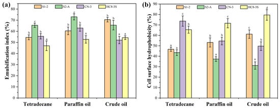 Emulsification activity (a) and cell surface hydrophobicity (b) of S1-2, S2-A, CN-3, and HC8-3S cultivated in MSM with different carbon sources (tetradecane, paraffin oil, and crude oil). The letters above the columns represent significant differences (p < 0.05) among various groups using the one-way ANOVA test. Error bars represent the standard deviation of three independent measurements.