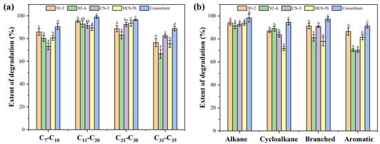 Degradation efficacy of petroleum hydrocarbons with diverse carbon numbers (a) and compounds (alkanes, cycloalkanes, branched alkanes, and aromatic hydrocarbons) (b) in crude oil by Pseudoxanthomonas sp. S1-2, Bacillus sp. S2-A, Dietzia sp. CN-3, Acinetobacter sp. HC8-3S, and the consortium. The letters above the columns represent significant differences (p < 0.05) among various groups through a one-way ANOVA test. Error bars represent the standard deviation of three independent measurements.