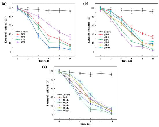 Different environmental stressors (temperature, pH, and salinity) play significant roles in bacterial activity and physiological performance in their habitats. As a result, the optimal cultural conditions for this constructed bacterial consortium to degrade crude oil were investigated. The influence of temperature on TPH removal is displayed in Figure 4a. The optimal temperature was 30 °C, with a TPH residual ratio of 5.1%. This was followed by temperatures of 37 °C (12.2%), 20 °C (15.6%), and 42 °C (33.7%). As shown in Figure 4b, residual TPHs varied from 3.2% to 34.1% in pH ranges of 5−10, with optimal TPH removal at pH 8. Notably, even at a strong alkaline pH of 10, TPH degradation remained at 76.3%, indicating minimal restriction in degradability. As Figure 4c shows, compared to temperature and pH, salinity had apparently less effect on crude oil utilization, showing the superiority of halotolerant bacteria. Crude oil degradation efficiencies were consistently above 85%, even under a high salinity of 100 g/L, displaying wonderful salinity tolerances. The optimal salinity was 40 g/L, slightly better than 20 g/L. In a word, functional optimization demonstrated that this consortium depleted crude oil effectively in a broad range of temperatures (20–37 °C), pH (6–9), and salinities (0–100 g/L).