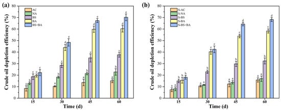 Crude oil depletion of AC, NA, BS, BA, and BS + BA treatments in non-saline soil microcosms (a) and S-AC, S-NA, S-BS, S-BA, and S-BS + BA treatments in salt-enriched soil microcosms (b) after 15, 30, 45, and 60 d. The letters above the columns (a, b, c, d, e) represent significant differences (p < 0.05) among various groups. Error bars represent the standard deviation of three independent measurements.