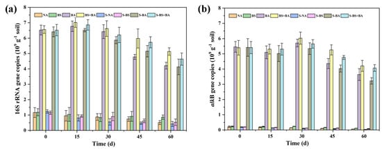 The gene copies of 16S rRNA (a) and alkB (b) in different treatments after 0, 15, 30, 45, and 60 d. Error bars represent the standard deviation of three independent measurements.