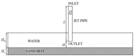 The jet sand scouring model in this study primarily comprises an upper free water layer, a lower non-cohesive sand bed, and a jet pipe, as illustrated in Figure 1. The dimensions of the experimental water tank shown in Figure 1 are 5000 mm × 350 mm × 400 mm (length × width × height). The side walls and the base of the tank are made of transparent glass to facilitate observation during the experiment. The vertical distance between the water level inside the tank and the flat plate is 180 mm. In this representation, D denotes the internal diameter of the jet pipe, while L represents the length of the jet pipe. The jet medium enters from the inlet above the pipe and is subsequently expelled from the outlet. Hw designates the depth of the free water layer, a constant in this study, as the influence of water depth on jet scouring characteristics is not considered. Hs signifies the depth of the non-cohesive sand layer, a variable adjusted according to the intensity of jet scouring. H stands for the impinging distance of the jet, a crucial independent variable in this study. Due to the relevance to the application of jet dredging in estuarine and coastal engineering, as well as the ease of obtaining 0.77 mm sediment, which facilitates uniform layering and distribution, this particle size was selected as the sand bed material for this study. Detailed parameters of the model and non-cohesive sand are provided in Table 1.