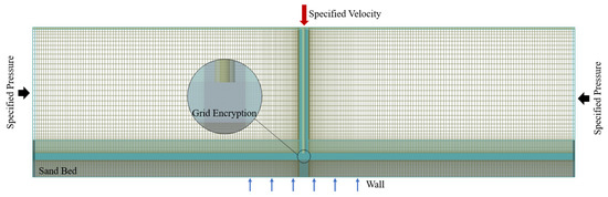 The boundary pressure is set to 0 Pa, and the height is set to 0.16 m. This indicates that below 0.16 m, the pressure follows hydrostatic pressure distribution. This setup ensures that the fluid at the boundary reaches a steady state, thereby achieving better flow continuity. The inlet of the jet pipe is configured as the velocity inlet and is dynamically adjusted in real time based on computational conditions. The bottom of the domain is specified as a no-slip wall [31,32,33]. The mesh and boundary conditions of the computational domain are visually depicted in Figure 2.
