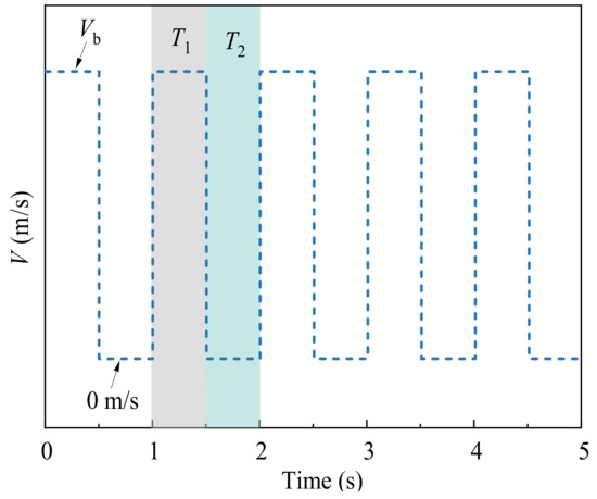 In this study, we employed the TruVOF (True Volume of Fluid) method. The time step was set to 0.001 s, and to ensure numerical accuracy, 100 iterations were performed for each time step, with a convergence criterion of 10−5. The total computation time was 10 min [34]. In addition, the focus of this study is to introduce the pulse characteristics into the impulse jet in order to investigate its scouring characteristics; therefore, a pulse velocity condition must be imposed at the inlet of the jet pipe, as shown in Figure 3. To accurately capture the dynamic changes in pulsating velocity, a pulse frequency of 1 Hz was selected for this study [35]. As can be seen from the figure, a square-wave pulse was used in this study with a pulse period T of 1 s. The square-wave pulse implies that the inlet velocity of the jet pipe switches back and forth between the maximum velocity Vb and the minimum velocity 0. The inlet velocity of the jet pipe is the same as that of a square-wave pulse. In simple terms, within a pulse period T of 1 s, T1 represents the complete injection time of the jet, and T2 represents the complete stopping time of the jet.