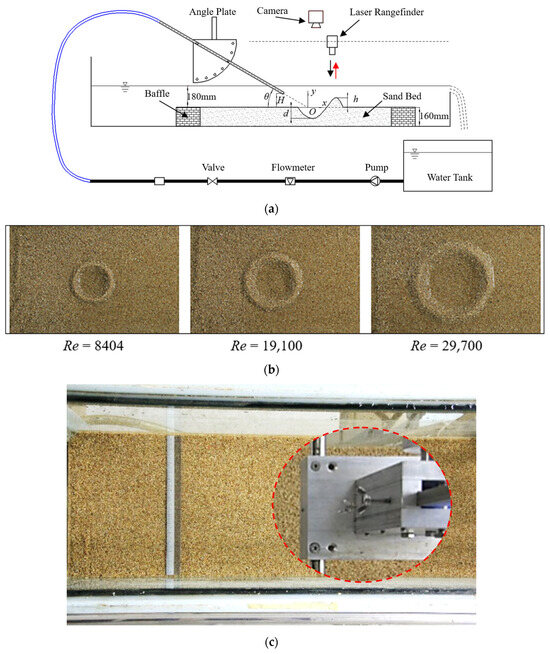 As illustrated in Figure 4c, the red dotted circle indicates the movable laser rangefinder, which was installed above the flume and equipped with an infrared ranging sensor with a measurement accuracy of 0.1 mm. After the erosion experiment, the ranging device moves slowly from left to right, while recording the changes in the surface depth of the sand bed, and the data are fed back to the computer. The jet lasted for approximately 4 h until no further changes were observed on the surface of the sand pit. When the depth and diameter of the sand pit remain unchanged for 10 min, it can be considered that the scouring and deposition processes have reached dynamic equilibrium. In this equilibrium state, the fluid’s shear force and scouring force are balanced with the sand particles’ resistance to erosion, ensuring that the sand particles are neither continuously scoured nor deposited. During the experiment, the leveling of the sand bed was mainly conducted in two steps: Firstly, after each set of experiments was completed, a leveling device (Iron trowel) was utilized to smooth the surface of the sand bed. Secondly, an infrared laser measuring instrument was employed to measure the flatness of the sand bed surface to ensure it met the experimental requirements. If the flatness did not meet the standard, we repeated the first and second steps until the desired flatness was achieved.