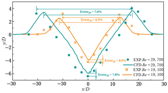 Simultaneously, numerical simulations of sand flushing by continuous jets were conducted using FLOW-3D software. The shapes of the sand pits formed by continuous jets impinging on the sand bed with different initial velocities were captured in xy profiles. A comparison between the numerical simulation results and the experimental values is presented in Figure 5. As can be observed in the figure, the numerical simulation results of the stable morphology of the sand pit closely align with the experimental results, exhibiting nearly identical ranges of development on the x and y scales. However, it is essential to acknowledge a certain deviation between the experimental and numerical results. Specifically, when Re = 19,100, the predicted value of the central part of the scouring pit is slightly higher than the experimental value. As the shape of the scouring pit expands to both the sides, the predicted value becomes slightly lower than the experimental value. With an increase in Re to 29,700, the predicted values are slightly higher than the experimental values in the central part of the scouring pit and slightly lower than the experimental values in the dune part. This phenomenon can be attributed to the uneven distribution of sand particles in the experimental sand bed (variations in the size, shape, and quantity of sand particles), which can cause localized differences in fluid dynamics, and consequently affect the scouring results. Additionally, the variation in the porosity of the sand bed at different depths may lead to changes in fluid flow patterns, whereas our numerical simulations typically assume a uniform sand particle distribution. Moreover, numerical models often rely on certain idealized assumptions, such as a stable sand bed and ideal particle shapes, which may oversimplify the flow field and scouring patterns. In summary, it can be concluded that the results of the numerical simulation are credible, and the employed numerical methods are suitable for the study of pulsed jet scouring characteristics. Depth and diameter were the most influential factors in the bunker profile data. The errors of the depth of the bunker under the two working conditions were 7.8% and 8.9%, while the errors of the radius of the bunker were 6.5% and 7.6%, respectively. All these errors were controlled within 10%, which verified the reliability of the numerical model proposed in this paper.