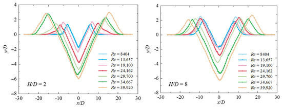 In numerical simulations, we typically assume that the sediment is uniformly distributed. However, in actual experiments, the physical characteristics of each sand grain cannot be completely identical, resulting in the non-uniform distribution of the sand layer. Nevertheless, whether in the experiments or the numerical simulations (as shown in Figure 4b and Figure 6), we observed asymmetry in the sand pit profile. This suggests that the non-uniform distribution of sand grains is not the primary cause of the asymmetric sand pit shape. In Figure 6, as the Reynolds number and impact distance increase, the asymmetry of the sand pit profile between the left and right sides becomes more pronounced. This phenomenon may be attributed to the increase in Reynolds number, which leads to greater turbulence intensity, allowing for enhanced turbulence to more effectively disturb the sand bed and facilitate sediment erosion and transport. Additionally, the increase in jet impact distance provides a broader area for turbulence to develop and mature, thereby influencing the dynamics of the sand bed over a wider region. Therefore, we hypothesize that the complexity of the fluid dynamics under turbulent jet conditions may result in asymmetric erosion patterns, even with theoretically uniform sediment distribution.