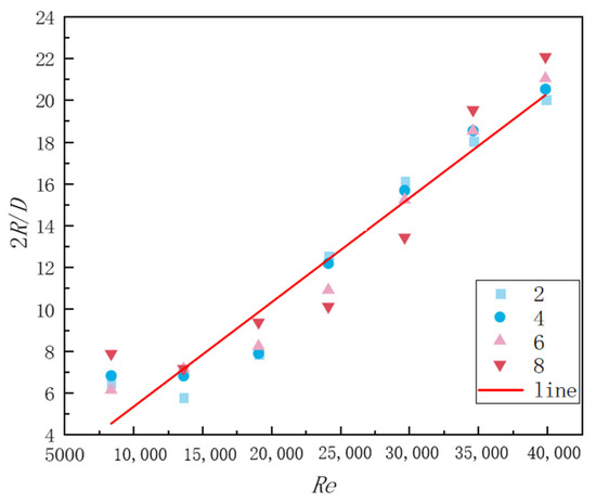 In order to visualize the relationship between the pit radius R and the inlet Reynolds number Re, the ratio of the pit diameter to the nozzle diameter, 2R/D, is used as the vertical coordinate, and the inlet Reynolds number Re is used as the horizontal coordinate, as shown in Figure 7. It can be seen from Figure 7 that 2R/D shows a linear increasing trend, along with the inlet Linear regression analysis of the scatter points in the figure, yielding the following equation for the relationship between 2R/D and Re. Where the Re takes values ranging from 8404 to 39,920. The equation R2 (COD) = 0.94684.