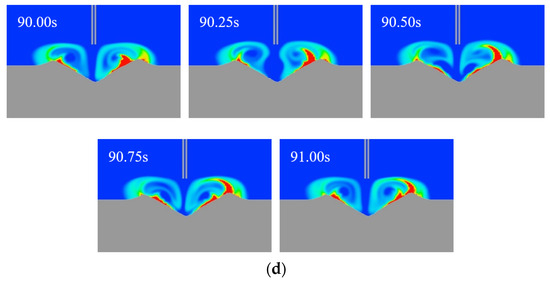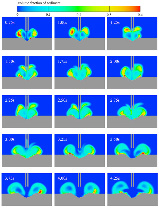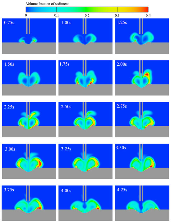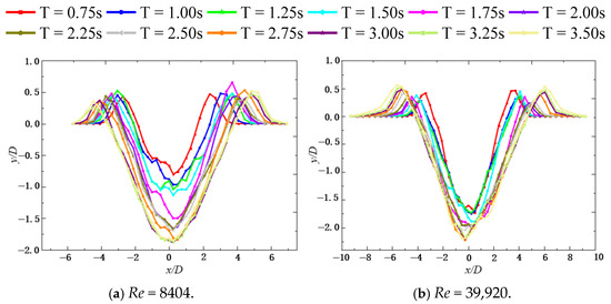 Figure 10 shows the deformation of the sand bed under the impact of the pulsed jets from 0.75 s to 3.5 s, with a 0.25 s interval. When the Reynolds numbers are 8404 and 39,920, the significant deformation of the sand pit and dune occurs within the first 0.75 s after the pulsed jet initiates, forming a basic shape. Between 0.75 s and 2 s, the sand pit depth |ymin| continues to increase, and around 2.75 s, the sand pit depth |ymin| reaches a relatively stable state. The dune forms its basic contour at the moment the jet starts, and its height ymax shows minimal variation over time, remaining mostly unchanged. This suggests that the pulsed jet exerts a strong force on the sediment, shaping the sand bed’s outline instantly. As time progresses, the suspended sediment primarily moves near the sand pit, exchanging with the bed surface sediment, which ultimately results in no significant changes in dune height during the initial phase.