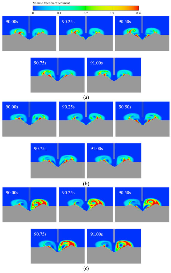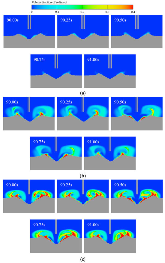 Figure 10 illustrates the suspended sediment concentration during one pulse jet cycle when the sand pit and dune have reached a steady state under different inlet Reynolds numbers (Re), specifically at 8404, 24,162, and 39,920. At Re = 8404, the relatively low Reynolds number of the pulsed jet results in a reduced impact force, causing suspended sediment to concentrate near the surface of the sand bed with low kinetic and potential energy. This occurs because the initial impact of the pulsed jet at a low Re creates a localized increase in pressure and shear stress, which is insufficient to transport sediment beyond the dune. Over time, the limited transport capacity prevents sediment from moving beyond the dune, leading to accumulation on both the sides of the pit’s bottom and near the dune. At Re = 24,162, the concentration and height of suspended sediment are significantly higher than those in the previous case, indicating that a greater pulsed jet flow rate generates a higher suspended sediment concentration due to the increased impact force. This is because the increased Reynolds number enhances the hydrodynamic forces at the point of impact, leading to greater sediment entrainment and suspension. Between 90 s and 90.25 s, the sediment impacted by the pulsed jet in the previous cycle gradually migrates towards the dune and its sides. This migration is driven by the turbulent mixing and advection created by the pulsed jet, which distributes the sediment across the sand bed. From 90.5 s to 91 s, after another round of impact by the pulsed jet, most of the sediment on both the sides of the pit’s bottom is pushed further away, while a smaller portion moves towards the dune and beyond. This indicates that the periodic nature of the pulsed jet further enhances the sediment transport process. The sediment transport at Re = 39,920 follows a pattern similar to that at Re = 24,162, but with a much higher sediment concentration. This phenomenon further underscores that higher pulse jet flow velocities result in greater impact forces and increased sediment transport due to the impact. The high Reynolds number increases the energy available for sediment entrainment, resulting in more pronounced sediment suspension and transport. As the pulsed jet continues to impact the sediment, the interaction between the hydrodynamic forces and the sediment dynamics leads to a dynamic equilibrium. This equilibrium is characterized by the continuous mixing and redistribution of suspended sediment, demonstrating how variations in Reynolds number and jet characteristics can significantly influence the sediment dynamics within the system.