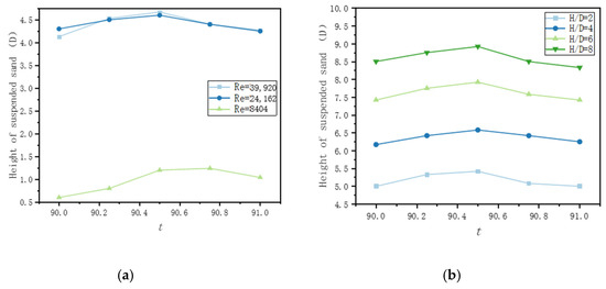 In Figure 12a, the first 0.5 s represents the jet active phase, while the latter 0.5 s represents the jet-off phase. The suspended sand height for Re values of 39,920 and 24,162 is significantly higher than that for Re = 8404, which is due to the greater impact energy at the higher Reynolds numbers. It can be observed that the suspended sand heights for Re = 39,920 and 24,162 are quite similar, indicating that when Re exceeds 24,162, its influence on the suspended sand height diminishes. Throughout the entire pulsation cycle, the peak suspended sand height for the high Reynolds numbers occurs just after the jet stops, followed by immediate sediment settling. In contrast, at the lower Reynolds numbers, the suspended sand height can be maintained for a short period after the jet stops. In Figure 12b, the peak suspended sand heights for all the conditions occur right after the jet ceases, as the suspended sand loses the momentum provided by the jet and begins to settle due to gravity. Additionally, the suspended sand height increases as the impact distance grows. This may be because at shorter impact distances, the jet’s energy is concentrated in a smaller area, whereas with greater impact distances, the expansion of the flow field leads to a more even energy distribution, acting over a wider area of the bed sediment. This expansion not only increases the jet’s influence range, but also allows for more sediment to be entrained into the fluid and reach higher heights. Figure 13 shows the trend of suspended sand height with a volume concentration of 0.1 over time within one cycle.