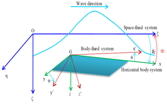 Furthermore, is the sway; is the heave; is the roll; is the pitch angle; is the yaw; is the constant heading angle; is the varied heading angle with the yaw motion; are the wave exciting forces on ith direction, including the Froude–Krylov component, the hydrostatic component, and the diffraction component. are the amplitude and initial phase of swaying when the wave amplitude is 1 m; are the amplitude and initial phase of yawing when the wave amplitude is 1 m; is the wave amplitude. are the coupling seakeeping coefficients, and 2, 3, 4, 5, and 6 denote the direction in the sway, heave, roll, pitch, and yaw motions, respectively.