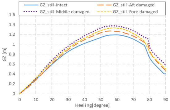 The righting arms in calm water under the intact condition, under an aft cabin-damaged condition, under a middle cabin-damaged condition, and under a fore compartment-damaged condition are shown in Figure 4. The longitudinal bulkhead is not set, and this means the damaged compartment is symmetrical between the port and starboard sides. Therefore, there is no initial heeling angle when the compartment is damaged in calm water. At the same time, the damaged compartment is asymmetric for the midship of the ship. Therefore, there is an initial pitching angle, as shown in Table 2, which is calculated by one static balance method. A static balance method and a buoyancy loss method are used to calculate the GZ in calm water under damaged conditions. The righting arms in calm water under the damaged condition are better than those under the intact condition, as shown in Figure 4. The reasons are as follows: (1) there is no initial heeling angle due to symmetrical ingress water; (2) the gravity of the ingress water is lower than the ship’s gravity. If the ingress water is looked at as one part of the ship, the GM becomes larger, such as the middle- and aft-damaged conditions.