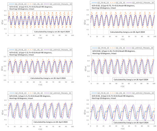 The effect of wavelength on the different methods for calculating GZ in waves with φ = 10 degrees, Fn = 0.0, H/Lpp = 0.02, and χ = 90 degrees.