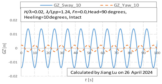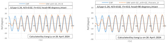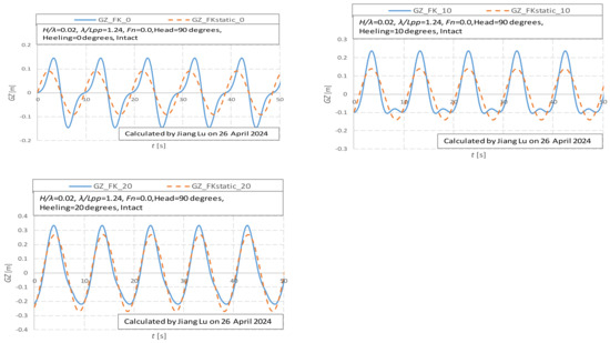 The significant roll motion in beam seas is also one of the problems related to the roll-restoring force. The restoring force variations and based on the Froude–Krylov assumption can be defined as follows: are the nonlinear Froude–Krylov and hydrostatic moments, which are calculated by integrating the incident wave pressure around the instantaneous wetted hull surface with the heave and pitch motions considered. is the only Froude–Krylov moment with the instantaneous wet hull. The and in waves depend on the ship motions, and the amplitude and phase of the heave and pitch are obtained by an enhanced strip method with the upright hull, and then time-domain heave and pitch motions are obtained using instantaneous relative position between the ship and wave. The roll angle is restricted to a constant value when we calculate GZ. The amplitude and initial phase of can also be calculated with the heave and pitch obtained by a static balance method with a constant heeling angle, and is the only Froude–Krylov moment with the wet hull considering heave, roll, and pitch with a static balance method.