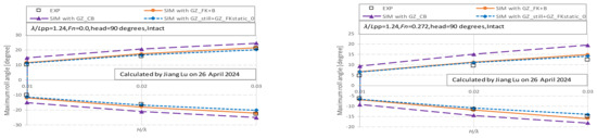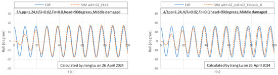 The comparisons of the roll amplitudes between the experiment and three numerical methods under intact and middle-damaged conditions with Fn = 0.0, 0.272, λ/Lpp = 1.243644, H/Lpp = 0.02, and χ = 90 degrees are shown in Figure 9, Figure 10, Figure 11 and Figure 12. The simulations with and have a good agreement with experimental results, while that with overestimates the roll motion in regular beam seas. The reasons are that the amplitudes of and are near the same as shown in Figure 5 under this condition, while the method for could overestimate the amplitude of GZ. This paper prefers to use to predict large roll motion in regular beam seas due to its lower complexity than that of .