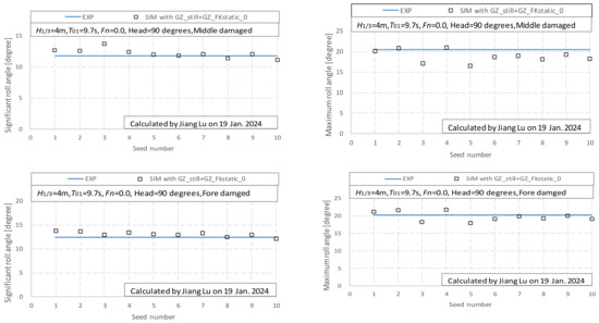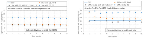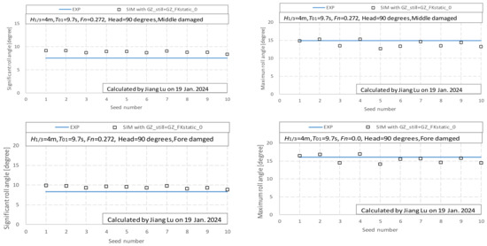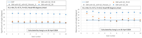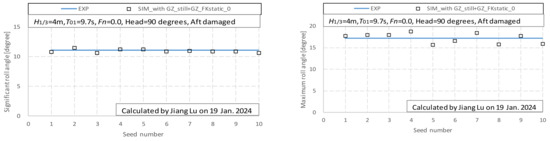 The comparisons of the significant and maximum roll angles between the experiment and three numerical methods under the intact condition with Fn = 0.0, 0.272, T01 = 9.7 m, H1/3 = 4 m, and χ = 90 degrees are shown in Figure 13. The simulations with have a good agreement with the experimental results. The simulations with have a good agreement with the experimental results except in the case of seed number 1, while that with also overestimates the roll motion in irregular beam seas. The reasons are that the method for could overestimate the amplitude of GZ with the subharmonic waves, as shown in Figure 5, especially in the short waves.