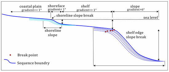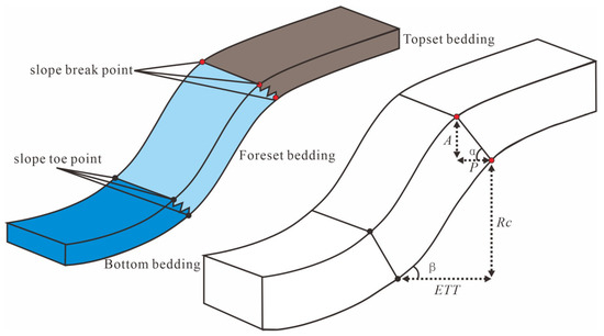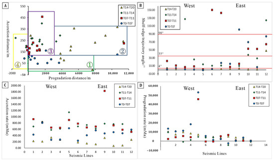 The shelf-edge trajectory migration is composed of a series of slope breakpoints, which record the development and evolution of the shelf edge (Figure 4). Its morphology can be characterized by the following parameters [7]: (1) accretion distance and progradation distance between the shelf edge, (2) accretion rate and progradation rate, (3) sediment flux, (4) shelf-edge trajectory angle, (5) horizontal distance and vertical distance between slope break point and slope toe point, and (6) slope topography angle.