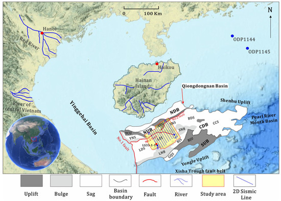 The QDNB, in the northern South China Sea, covers approximately 4.5 × 104 km2 with a maximum water depth of the QDNB > 3000 m. With an arc-shaped spreading around Hainan Island with an NE-SW orientation (Figure 2). This sedimentary basin has good hydrocarbon reservoir formation conditions and promising exploration prospects [18]. The QDNB is bounded by the Shenhu Uplift to the east, the Yinggehai Basin and No. 1 Fault to the west, the Yongle Uplift to the south, and Hainan Island to the north [19,20,21]. From north to south, the basin can be divided into four primary tectonic units, including the Northern Depression Belt, Northern Uplift Belt, Central Depression Belt, and Southern Uplift Belt (Figure 2). The Northern Depression Belt is composed of the Yabei Sag, Songdong Sag, and Songxi Sag. The Central Depressional Belt consists of the Yanan Sag, the Ledong Sag, the Lingshui Sag, the Baodao Sag, the Songnan Sag, and the Beijiao Sag [16,22].