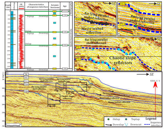 The lithology changes above and below the T20 sequence boundary, with sandstone above the sequence boundary and mudstone below the sequence boundary. GR log curve (Figure 5) is abnormally small at the sequence boundary, showing a zigzag bell shape above the sequence boundary and a zigzag box shape below the sequence boundary. The lithology changes above and below the T14 sequence boundary, with fine sandstone above the sequence boundary and mudstone below the sequence boundary. The GR curve is abnormally small at the sequence boundary (Figure 5), showing a zigzag bell shape above the sequence boundary and a zigzag box shape below the sequence boundary. The lithology changes above and below the T11 sequence boundary, with mudstone above the sequence boundary and thin sandstone below the sequence boundary. The GR curve is abnormally small at the sequence boundary (Figure 5), and the upper and lower parts of the sequence boundary are sawtooth bell-shaped. The T07 sequence boundary is dominated by medium-weak amplitude and medium-high continuous seismic reflection in the shelf area, and a typical onlap can be seen. The shelf-edge deposits are mainly progradated, and the formation thickness is small (40~90 m). In the slope area, the main axis is the medium-high amplitude and low-continuous seismic reflection, and local top superimposed and truncated structures can be seen. The deep-water area shows a meso-strong amplitude and medium-continuous type of sheet seismic reflection, with a wide range of lower superstructures above the sequence boundary, and large-scale seismic in-phase axes of strong amplitude, high continuity, and medium frequency can be seen. T0 is the seabed (Figure 5).