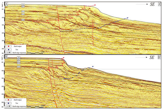 Two seismic sections (AA’ and BB’) which shown the shelf-edge migration trajectories, see locations in Figure 1. Shelf edges and toes are marked by red and blue dots, respectively.