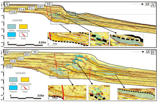 Mass transport deposits (MTDs) are a kind of event deposits formed by the instability and collapse of continental slope sediments [44,45]. There is a chaotic reflection on the profile, and residual blocks retaining the original formation information can be seen inside. The thrust fault can be seen on the toe, with poor continuity and weak amplitude reflection characteristics (Figure 8).
