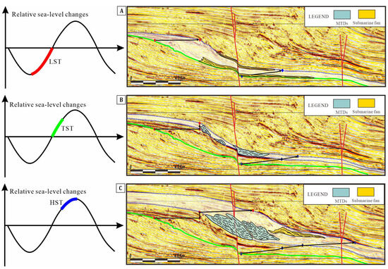 Relationship between relative sea level and shelf-edge trajectories. Three combinations of the shelf-edge trajectories with the corresponding stages of sea-level fluctuation. (A) LST has more submarine fans, (B) TST has more MTDs, and (C) HST has both of submarine fans and MTDs.