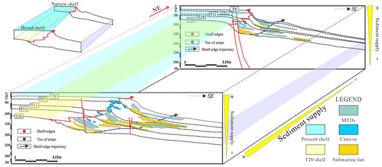 At 10.5 Ma, the subduction of the Pacific plate and the Eurasian plate, the right-lateral strike-slip action of the Red River fault, and the regional activity of Fault No. 2 caused the subsidence center to shift eastward, and the topography of the basin showed the characteristics of high in the west and low in the east, which has continued to the present day [20,54]. Since the Quaternary, the sedimentation rate of the QDNB peaked [55], and the difference between the sedimentation rates of the east and west part of the QDNB affected the sediment accumulation rate, resulting in the lateral difference of the shelf-edge trajectory in the study area (Figure 10 and Figure 11).