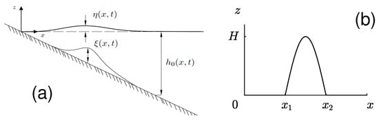 - Tuck, E.O.; Hwang, L.-S. Long wave generation on a sloping beach. J. Fluid Mech. 1972, 51, 449–461. [Google Scholar] [CrossRef]