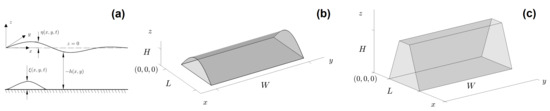 (a) Representative scheme of the coordinates system and of the 2 + 1D tsunami model, (b) sinusoidal landslide shape, and (c) trapezoidal shape of the landslide.