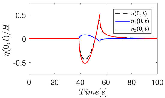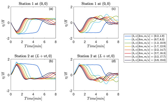 While the Froude number is a significant factor in landslide-generated tsunamis, our study aims to quantify the influence of all model parameters, including water depth. Here, we assume that , so the landslide is always submerged. Furthermore, we consider that the landslide moves at a subcritical velocity (v), and the waves generated are recorded by two stations, located at and . The objective of this test is to show how the waves change when the water depth changes (keeping the landslide parameters fixed). The inputs for this test are km, km, m, m/s, s, min, and km.