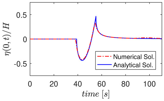 In Figure 4, the analytical and numerical solutions are in good agreement. In addition, it is possible to capture the maximum run-up and run-down together with the arrival times. Therefore, for theoretical analyses where the governing equations’ assumptions hold, the analytical solution is preferred due to its efficiency in reducing the calculation time.